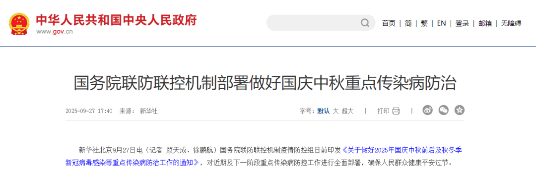 秋冬季是呼吸道、部分虫媒和肠道等传染病易发高发时期,多种传染病将交替或共同流行。国庆中秋假期即将来临,人员流动和聚餐活动增加,疫情传播风险和防控难度进一步加大。