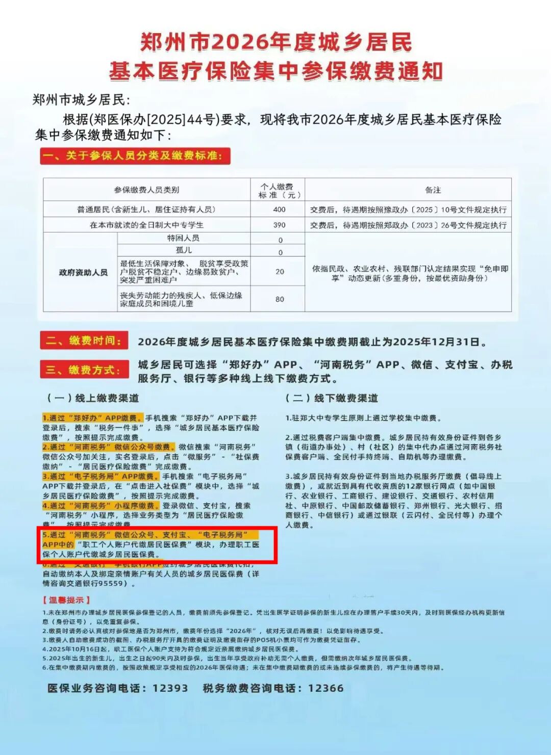 有职工医保个人账户的,2025年10月16日起,可以通过“河南税务”微信公众号、支付宝、“电子税务局”APP中的“职工个人账户代缴居民医保费”模块,为符合政策规定的近亲属缴纳城乡居民基本医疗保险费,代缴时间截至2025年12月31日。