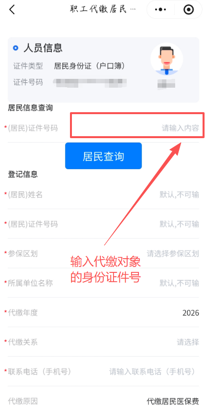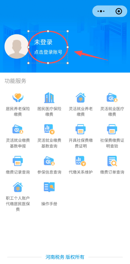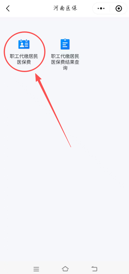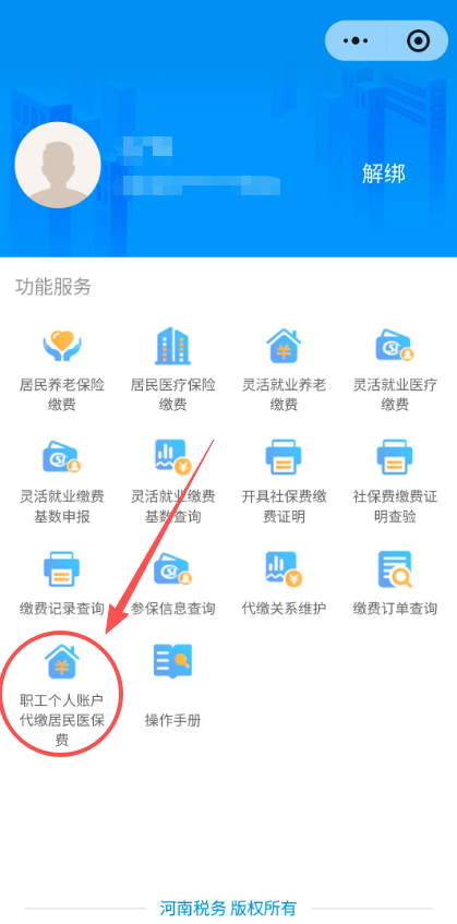 第一步:通过微信、支付宝搜索“河南税务”,点击“河南税务”小程序,进入“ 职工个人账户代缴居民医保费”模块,绑定账号 ,点击““职工个人代缴居民医保费”。