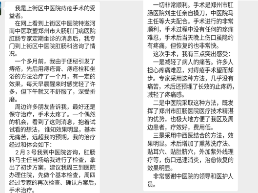 “手术基本无痛苦,远超我的预期!”另一位患者在网上看到上街区中医院特邀专家坐诊的消息后,果断前往求医。由郑州市大肠肛门病医院专家亲自操刀、基层医生密切配合的手术非常顺利。患者在分享中特别强调了三点深刻感受:一是极大减轻痛苦,先进术式与长效镇痛技术的应用,消除了对手术疼痛的传统恐惧;二是真正方便百姓,在家门口就能享受到省级顶尖专家的技术服务,且疗效好、费用低;三是中西医结合优势凸显,术后熏洗、穴位贴敷等中医特色疗法加速了康复进程。这份来自受益者的直观反馈,是对“专家下沉”模式价值最有力的说明。
