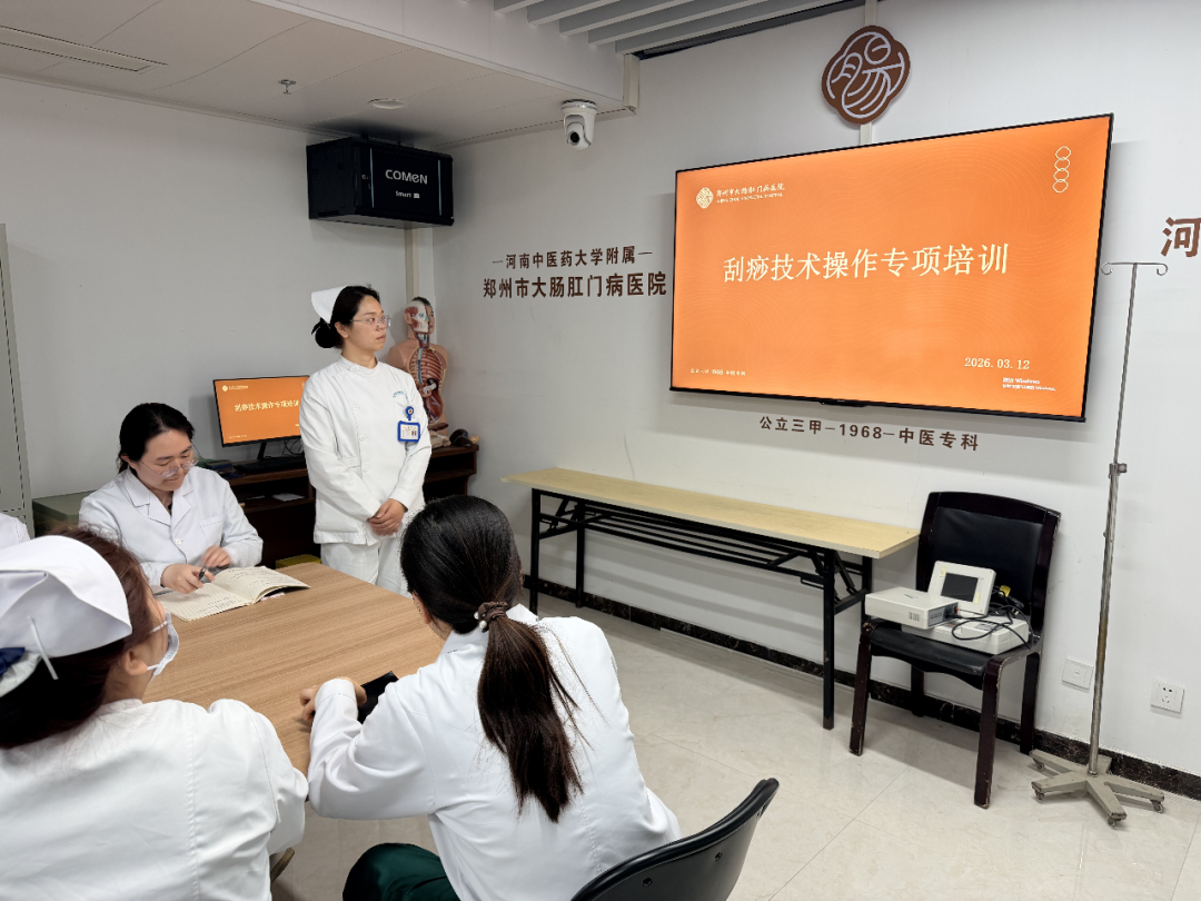 为积极推进中医刮痧的理论研究、临床应用及推广普及,培养一批熟练掌握运用中医特色技术的护理骨干人才,更好地服务于群众健康,结合我院肛肠专科护理特点,2026年3月12日下午,郑州市大肠肛门病医院组织开展了刮痧技术操作专项培训活动。护理部李素勤主任、朱桂霞副主任及各科室护理骨干参加活动。