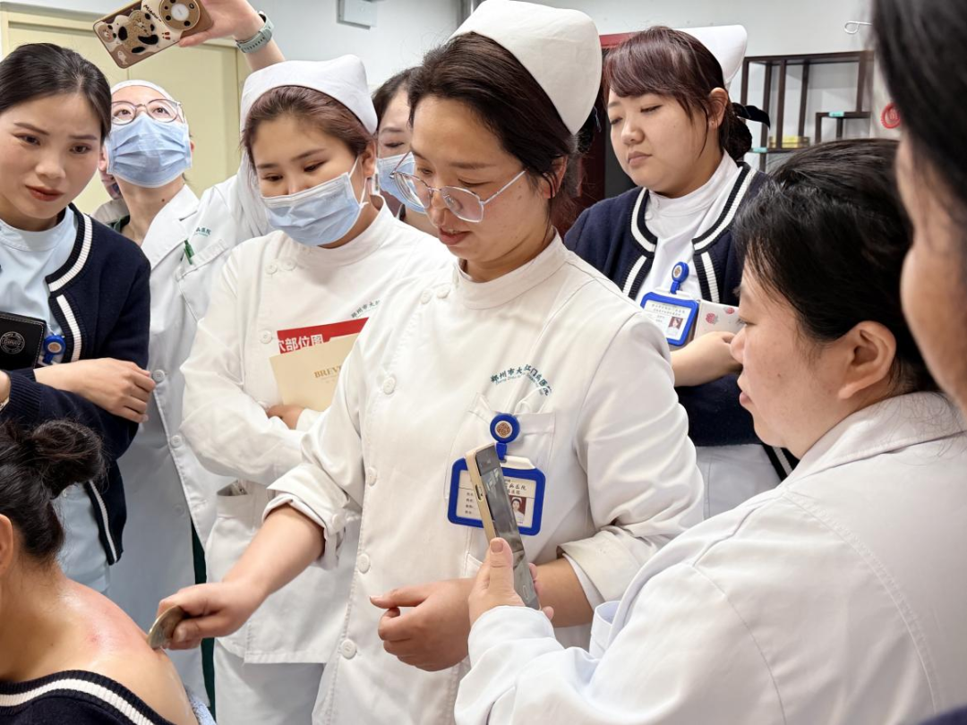 培训中,她结合临床典型病例,重点示范演练了头部刮痧手法,详细讲解了头部经络走向与常用穴位定位,着重演示了刮拭力度、角度、速度的控制技巧,并说明不同体质患者头部刮痧的调理侧重点。示范结束后,参训人员分组进行头部刮痧实操练习,肖凤杰护士逐组巡视指导,耐心纠正不规范操作,细致解答大家在实操中遇到的各类疑问,确保每一位参训人员都能熟练掌握标准的头部刮痧手法,真正做到学以致用。