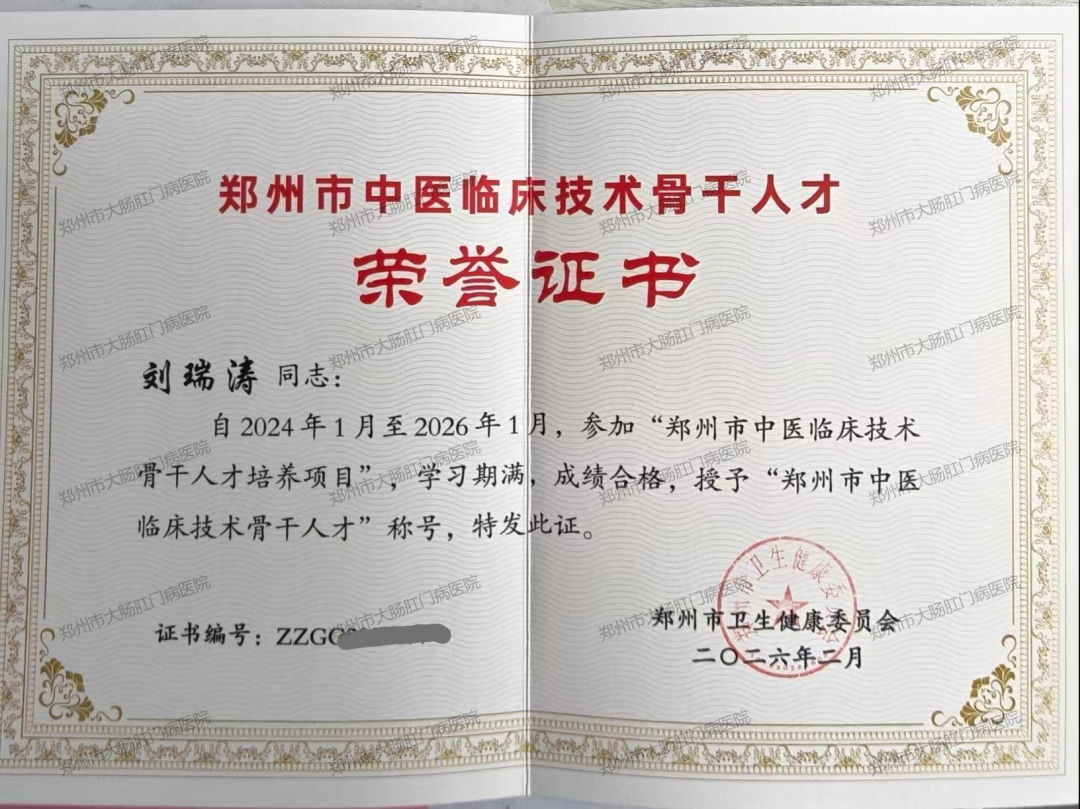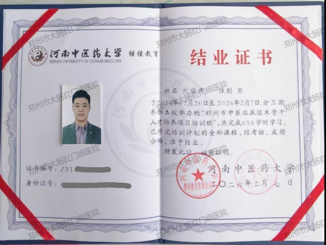 刘瑞涛主任作为我院中医临床骨干,自2024年7月至2026年2月,分三期在河南中医药大学参加培训,系统学习了培训计划的全部课程。研修期间,他严格遵守学习纪律,刻苦钻研中医经典,积极参与临床实践与跟师学习,充分展现了扎实的专业功底和良好的学术素养。经考核,成绩合格,顺利获得河南中医药大学颁发的结业证书,并被郑州市卫生健康委员会授予“郑州市中医临床技术骨干人才”称号。