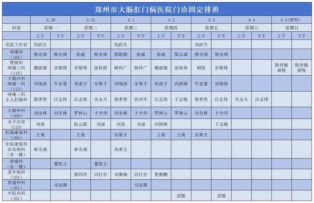 【就诊信息】门诊医生出诊排班表(3月30日——4月5日)