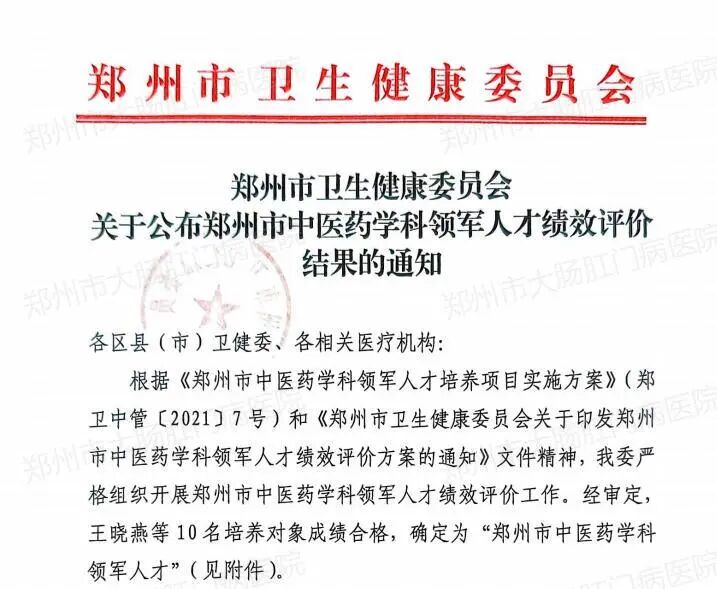 近日,郑州市卫生健康委员会公布郑州市中医药学科领军人才绩效评价结果,我院巩跃生院长凭借突出的学术成就、临床造诣与学科引领作用,顺利通过考核评价,被正式确定为“郑州市中医药学科领军人才”。