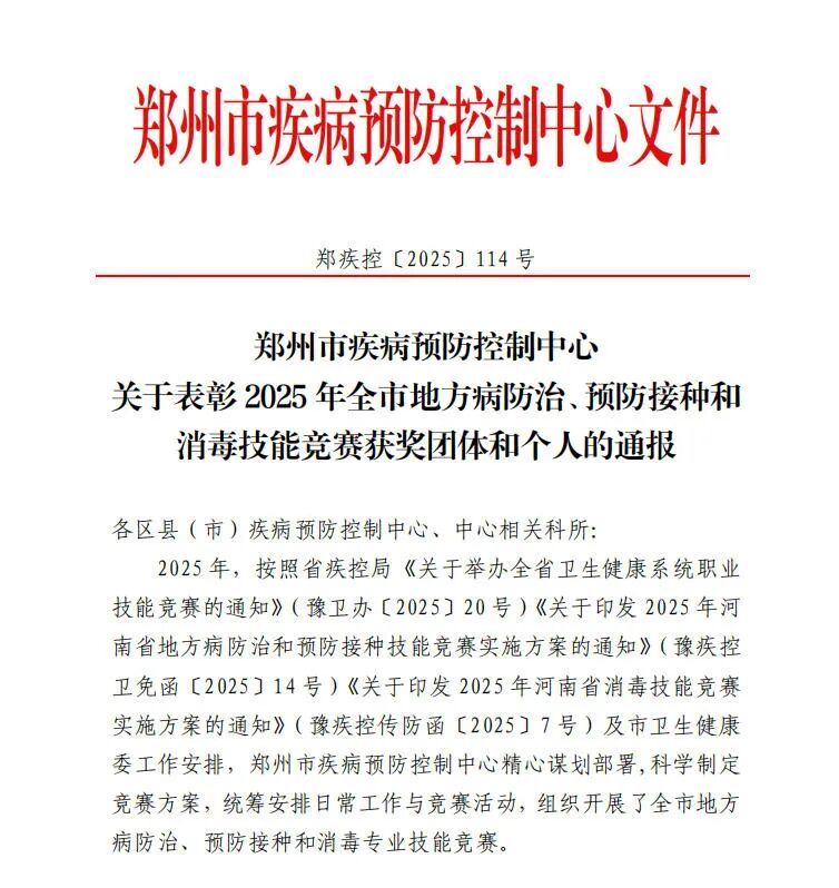 2025年9月15日,从郑州市疾病预防控制中心主办的全市地方病防治、预防接种和消毒专业技能竞赛现场传来喜讯,2025年全市消毒技能竞赛获奖团体赛中管城区代表队荣获三等奖,我院公共卫生科郝瑞贞主任凭借扎实的理论基础、娴熟的操作技能和出色的临场发挥,在激烈的角逐中脱颖而出,荣获消毒专业技能竞赛三等奖。