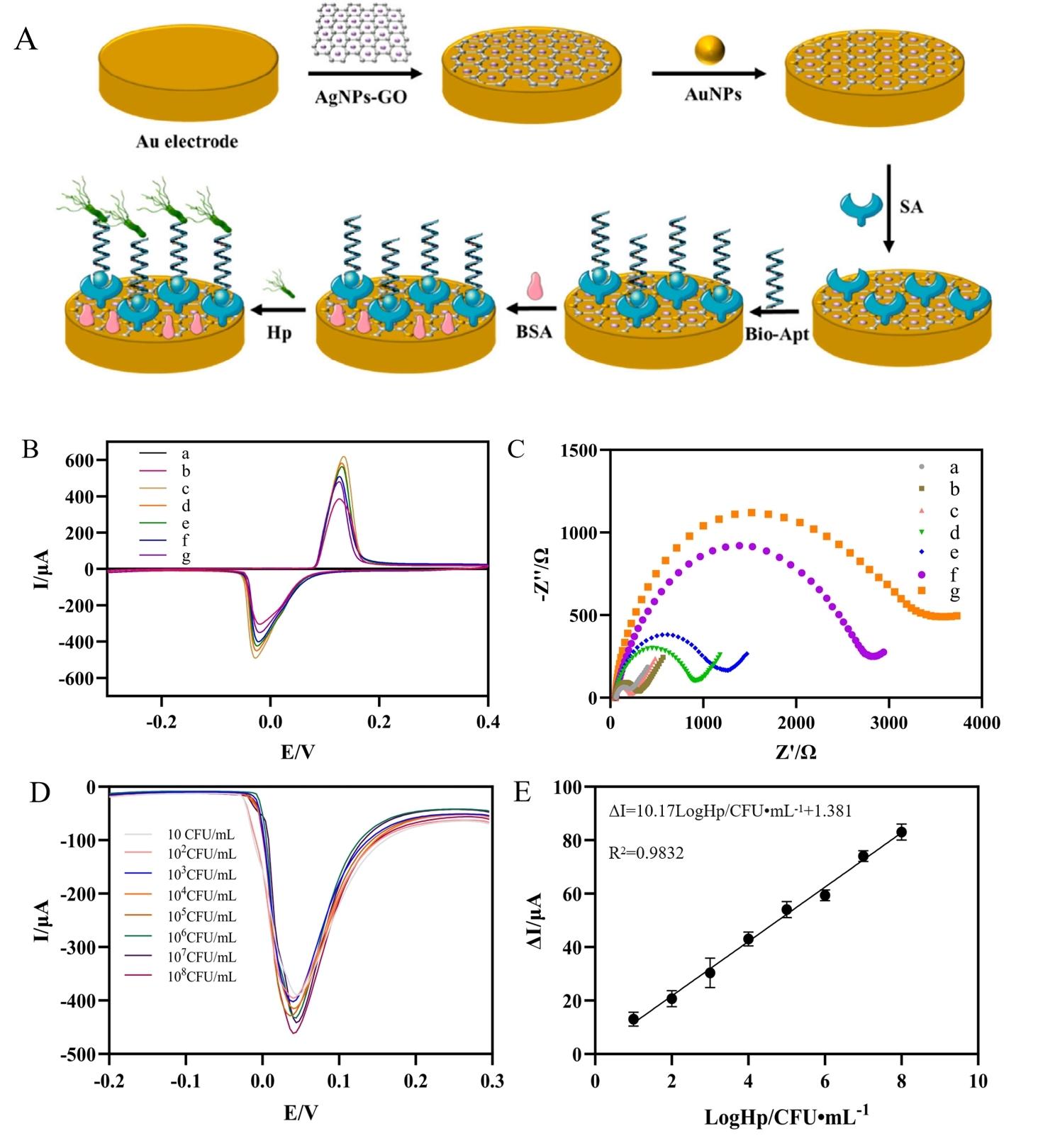 幽门螺杆菌(H. pylori)作为胃炎、消化性溃疡乃至胃癌的主要诱因之一,全球感染率超过50%,中国形势尤为严峻,其早期发现对预防胃癌至关重要。然而,现有检测方法在灵敏度、便捷性或成本上存在局限。为此,本研究团队融合前沿纳米技术与分子识别原理,创新性地开发了一种高精度电化学适体传感器。该传感器核心在于利用特异性识别幽门螺杆菌的适体作为分子探针,并创新性地采用金纳米粒子(AuNPs) 与负载银纳米粒子的氧化石墨烯(AgNPs-GO) 作为信号放大载体。具体而言,首先以葡萄糖为还原剂在氧化石墨烯(GO)表面原位还原制备AgNPs-GO纳米复合材料,其中AgNPs提供良好的生物相容性、化学稳定性及氧化还原性能,GO则提供大表面积以负载AgNPs;随后电沉积AuNPs进一步提升传感器导电性;并引入链霉亲和素(SA)以高效结合生物素修饰的适体。这种独特设计实现了对幽门螺杆菌的精准捕获与高效信号转换,使传感器能在血清和粪便样本中实现宽范围(101 CFU/mL - 108 CFU/mL)的特异性检测,最低检测限低至3 CFU/mL,在实际应用中展现出优异的灵敏度和检测性能。