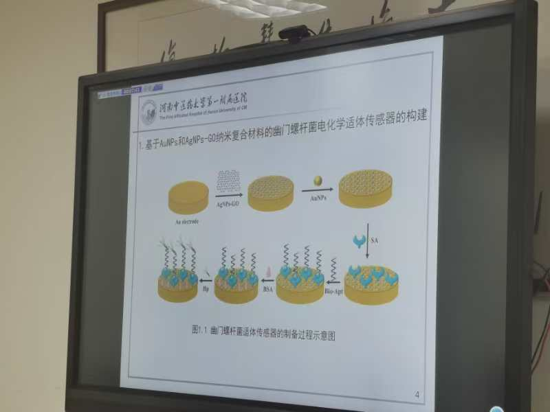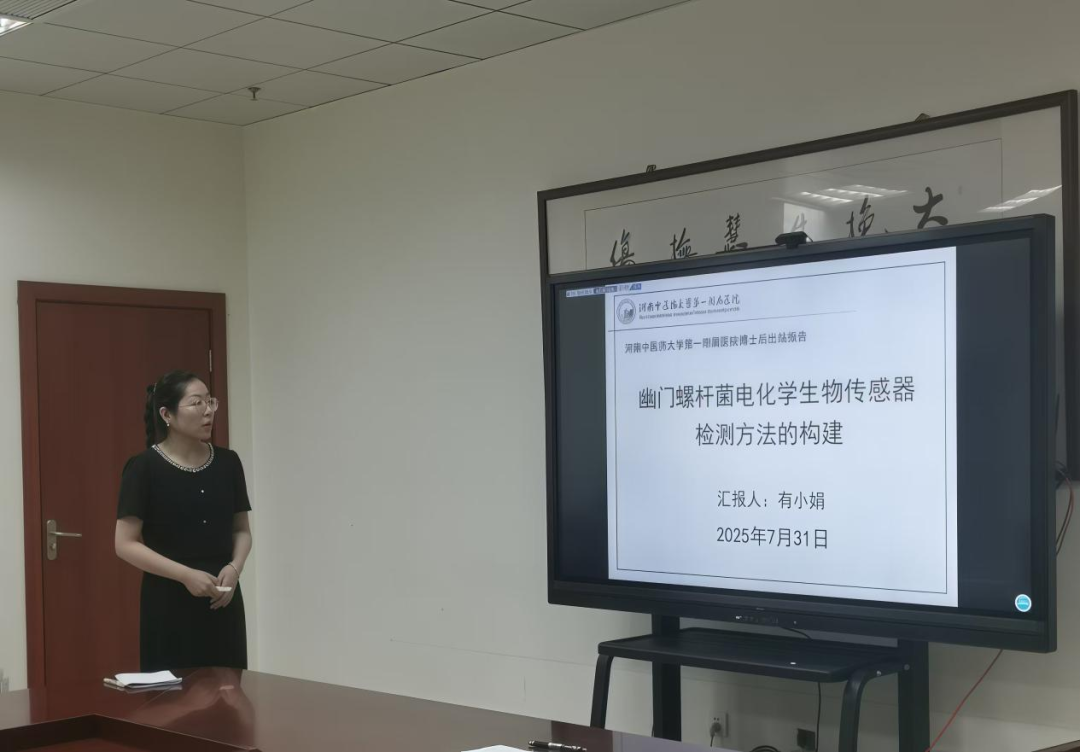 答辩现场气氛庄重而热烈,评审专家们齐聚一堂,认真听取有小娟博士的精彩汇报。有小娟博士的答辩题目为《幽门螺杆菌电化学生物传感器检测方法的构建》,她以扎实的专业知识、严谨的科研态度和清晰的逻辑思维,详细阐述了自己在博士后期间的研究成果。针对幽门螺杆菌现有检测方法存在的操作复杂、设备要求高、灵敏度不足等问题,构建了两种新型电化学生物传感器,实现对幽门螺杆菌的快速、灵敏、高特异性检测,两种传感器均克服了传统方法的局限性,为幽门螺杆菌感染的早期诊断、分型及个性化治疗提供了新工具,对相关疾病的预防和控制具有重要临床意义。从课题的提出背景到研究方法的选择,从实验数据的分析到最终结论的得出,有小娟博士都进行了深入而细致地讲解,充分展现了她在该领域的专业素养和创新能力。有小娟博士后在站期间,主持河南省博士后科研资助项目和河南省科技攻关项目各1项,研究成果在期刊《Frontiers in Bioengineering and Biotechnology》(IF:4.8,JCR 1区)发表论文1篇。