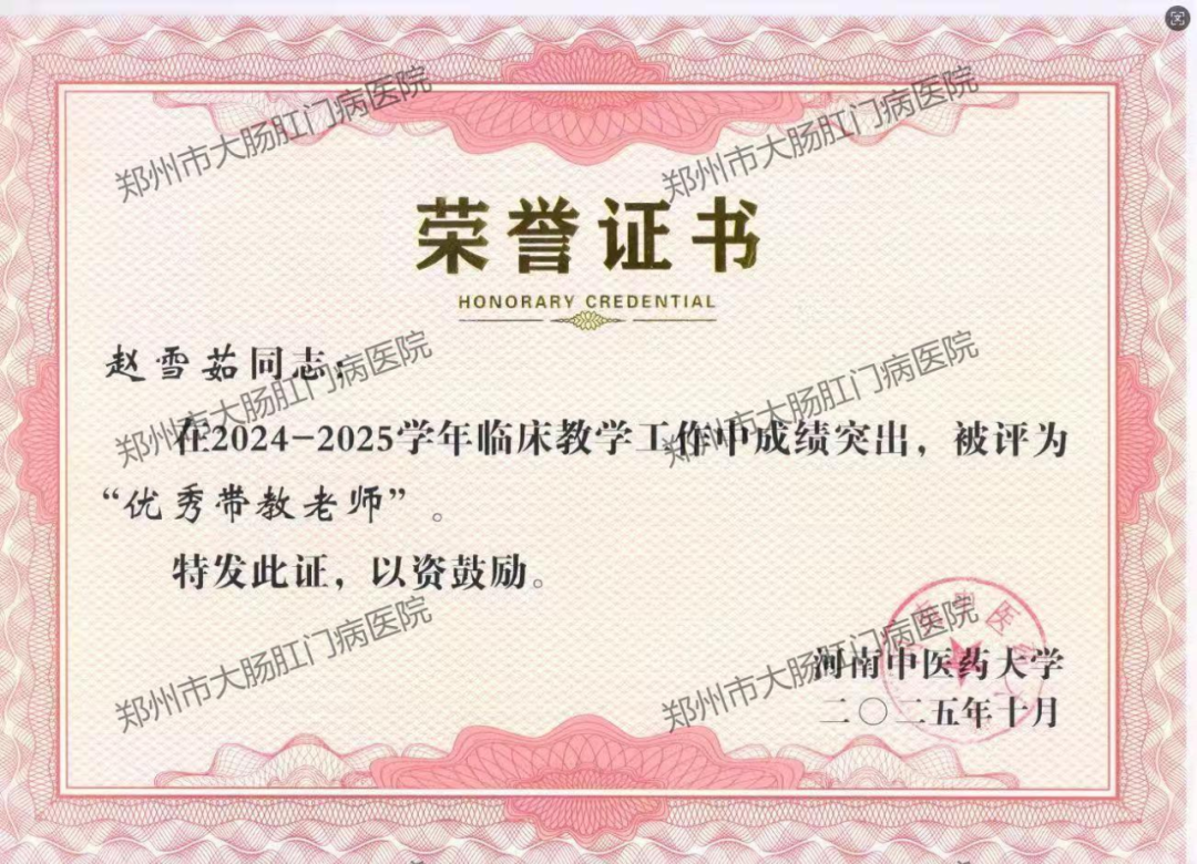 大会对在上一学年临床实践教学中表现卓越的带教老师进行了隆重表彰。其中,我院信息科赵雪茹副科长、大肠内科肖芳芳护士长凭借其出色的带教表现,荣获河南中医药大学2024-2025学年“优秀带教老师”称号。