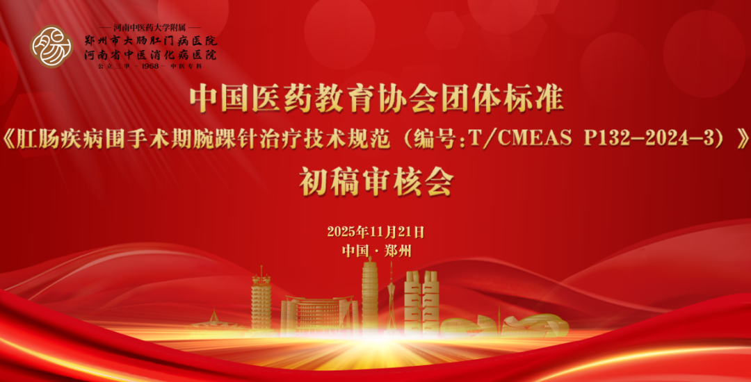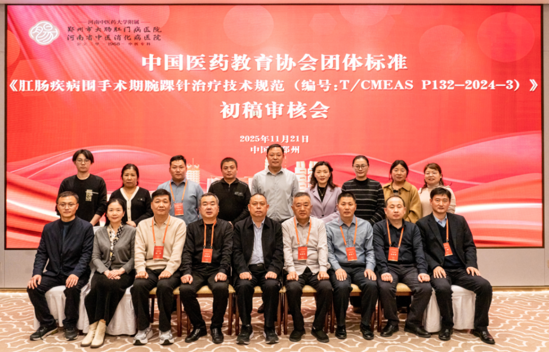 2025年11月21日下午,中国医药教育协会团体标准《肛肠疾病围手术期腕踝针治疗技术规范(编号:T/CMEAS P132-2024-3)》初稿审核会于郑州紫荆山宾馆成功举行。本次会议由河南中医药大学附属郑州市大肠肛门病医院(河南省中医消化病医院)主办,来自全国多家医疗机构的20余位专家齐聚一堂,共同推进这一中医特色治疗技术的标准化进程。