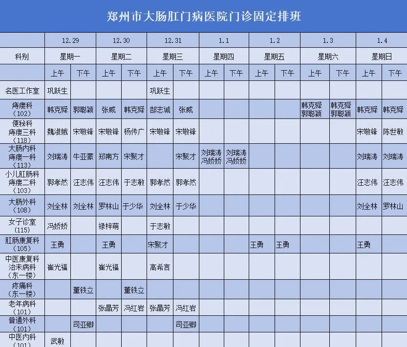 【就诊信息】门诊医生出诊排班表(12月29日——1月4日)