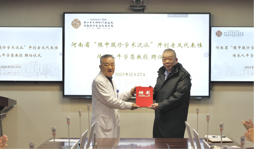 为深入推进中医药传承创新发展,加强中医特色诊疗技术传承,提升专科服务能力,2025年12月27日上午,郑州市大肠肛门病医院举行了简朴而庄重的"经方腹诊学术流派传承工作室"成立暨牛学恩教授聘任仪式。院领导班子全体成员、各科室负责人及骨干医师出席了此次仪式。