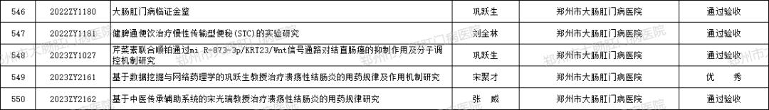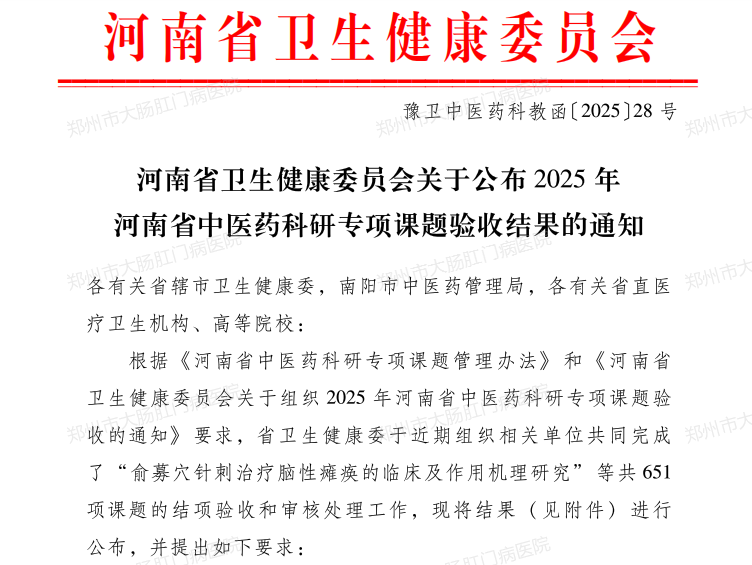 近日,河南省卫生健康委员会下发《关于公布2025年河南省中医药科研专项课题验收结果的通知》文件,我院科研工作再传捷报:由巩跃生院士、张威副院长、宋聚才副院长、刘全林主任分别牵头承担的五项河南省中医药科研专项课题均顺利通过验收,其中宋聚才副院长主持的课题以优秀成绩圆满收官,充分彰显了我院在中医药科研领域的扎实功底与创新实力。