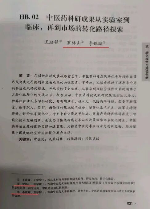 《中医药科技转化蓝皮书》是我国中医药领域首部系统关注科技成果转移转化的年度报告,旨在分析现状、梳理问题、引领方向,为政府决策、机构发展和企业投资提供关键参考,行业影响力深远。李姝璇副院长与罗林山主任凭借在中医药临床研究、特色疗法转化应用以及医院科研管理方面的深厚积淀,在河北水利电力学院王政锋教授引领下承担了报告中“HB.02 中医药科研成果从实验室到临床,再到市场的转化路径探索”章节的撰写与审编工作,将我院在推动院内制剂开发、特色技术标准化、产学研用结合等方面的成功经验与前沿探索融入国家层面的转化策略研究之中。