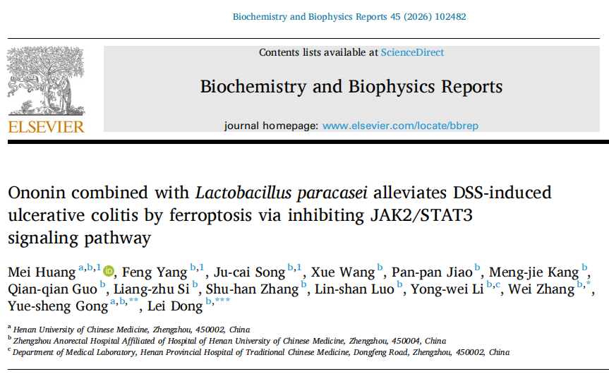 近日,郑州市大肠肛门病医院(河南中医药大学附属郑州市大肠肛门病医院、河南省中医消化病医院)中心实验室在读研究生黄梅,在巩跃生院士与实验室主任董雷博士共同指导下,依托医院中心实验室及实验动物中心平台,在国际权威期刊《Biochemistry and Biophysics Reports》发表题为“Ononin combined with Lactobacillus paracasei alleviates DSS-induced ulcerative colitis by ferroptosis via inhibiting JAK2/STAT3 signaling pathway”的研究论文。